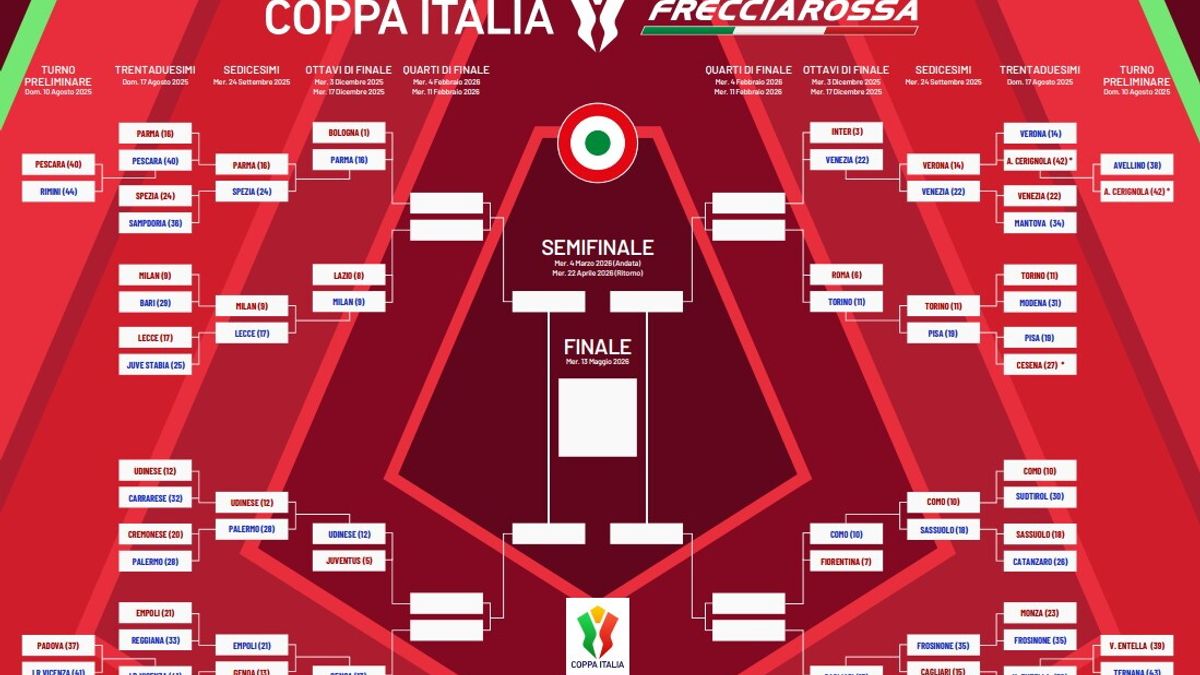 La Lega Serie A ha ufficializzato date e orari degli ottavi di Coppa Italia Frecciarossa, in esclusiva sul nostro sito e sui canali Mediaset. Il programma comincia con Juventus-Udinese martedì 2 alle 21.00 seguita da Atalanta-Genoa, mercoledì alle 15.00, Napoli-Cagliari, alle 18.00 e Inter-Venezia alle 21.00. Giovedì 4 dicembre le ultime due sfide del mese, il derby emiliano Bologna-Parma alle 18.00 e Lazio-Milan alle 21.00. Gli ultimi due ottavi, invece sono in programma a gennaio: martedì 13 Roma-Torino e martedì 27, Fiorentina-Como, entrambe alle 21.00.